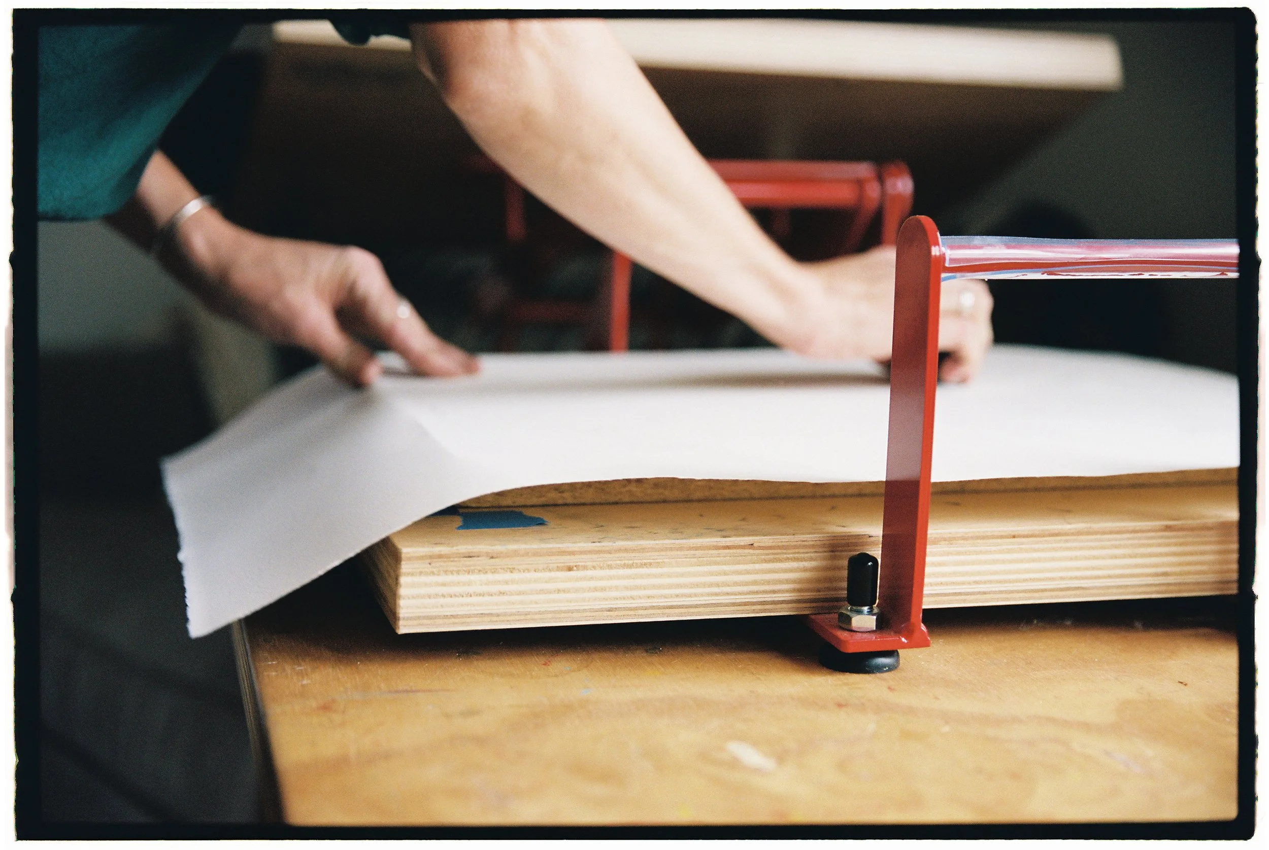 Once the image has been pressed, I lift the press and use a smooth stone from the beach to rub the back of the paper, which is still pressed onto the block. This is done to ensure that the image transfers evenly. The final stage of the printing process is gently pulling the print off the block and hanging it to dry in my studio. The drying process takes an average of five to six days.