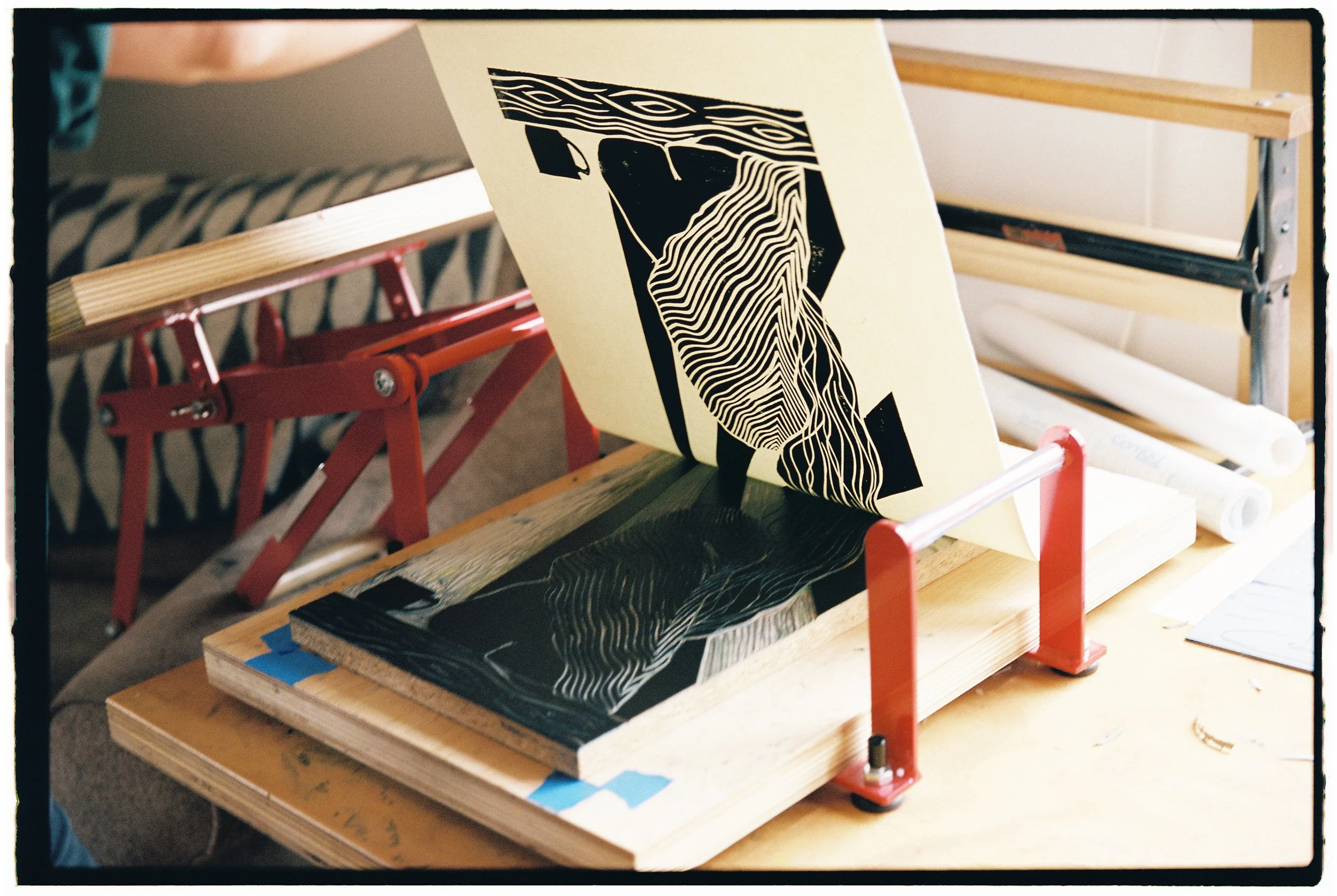 My primary medium has been linocut (otherwise known as block printing). I enjoy the process of thought and the methodical steps it requires, the raw, organic appearance, and the perfect imperfection of linocut.
