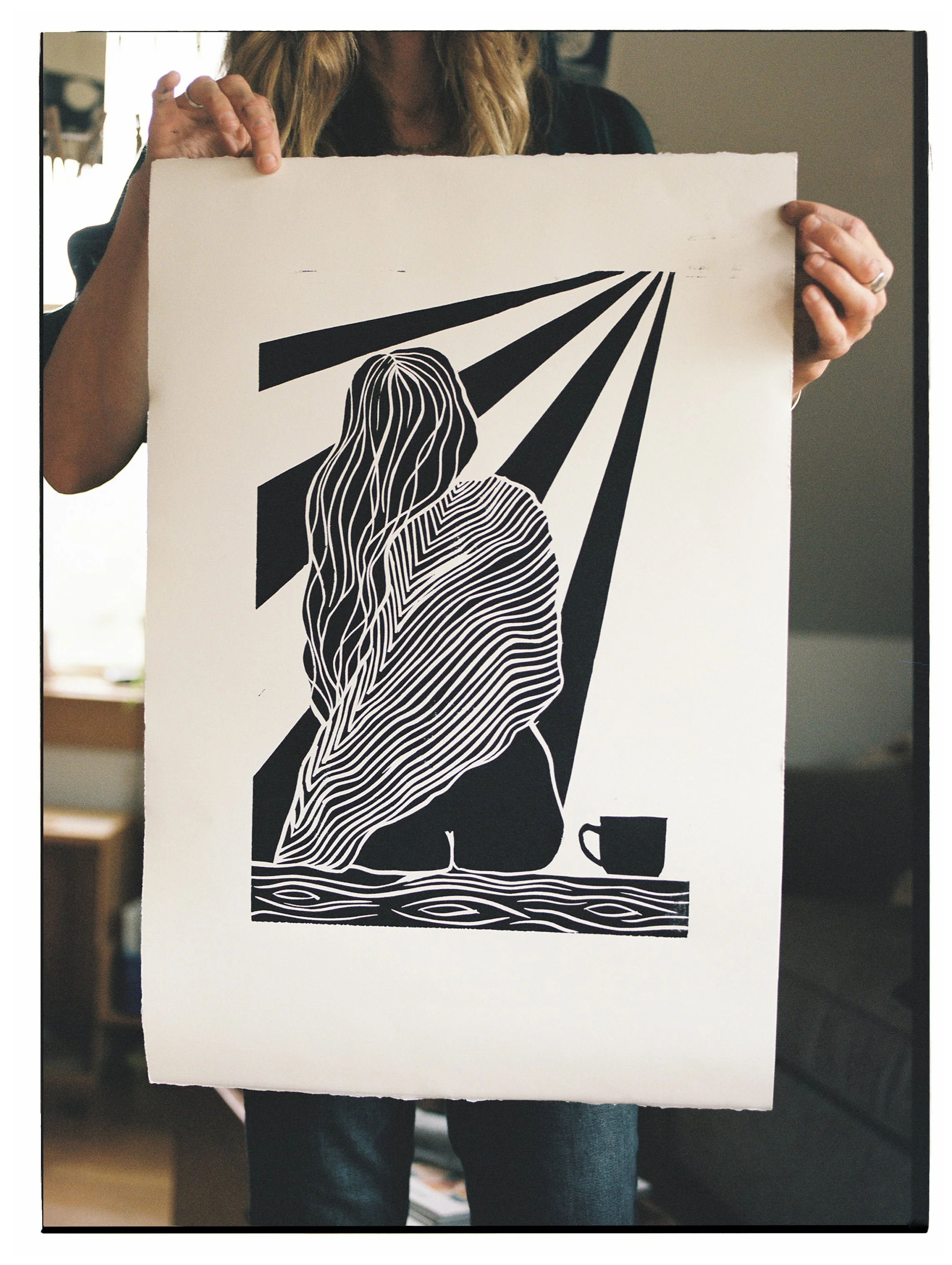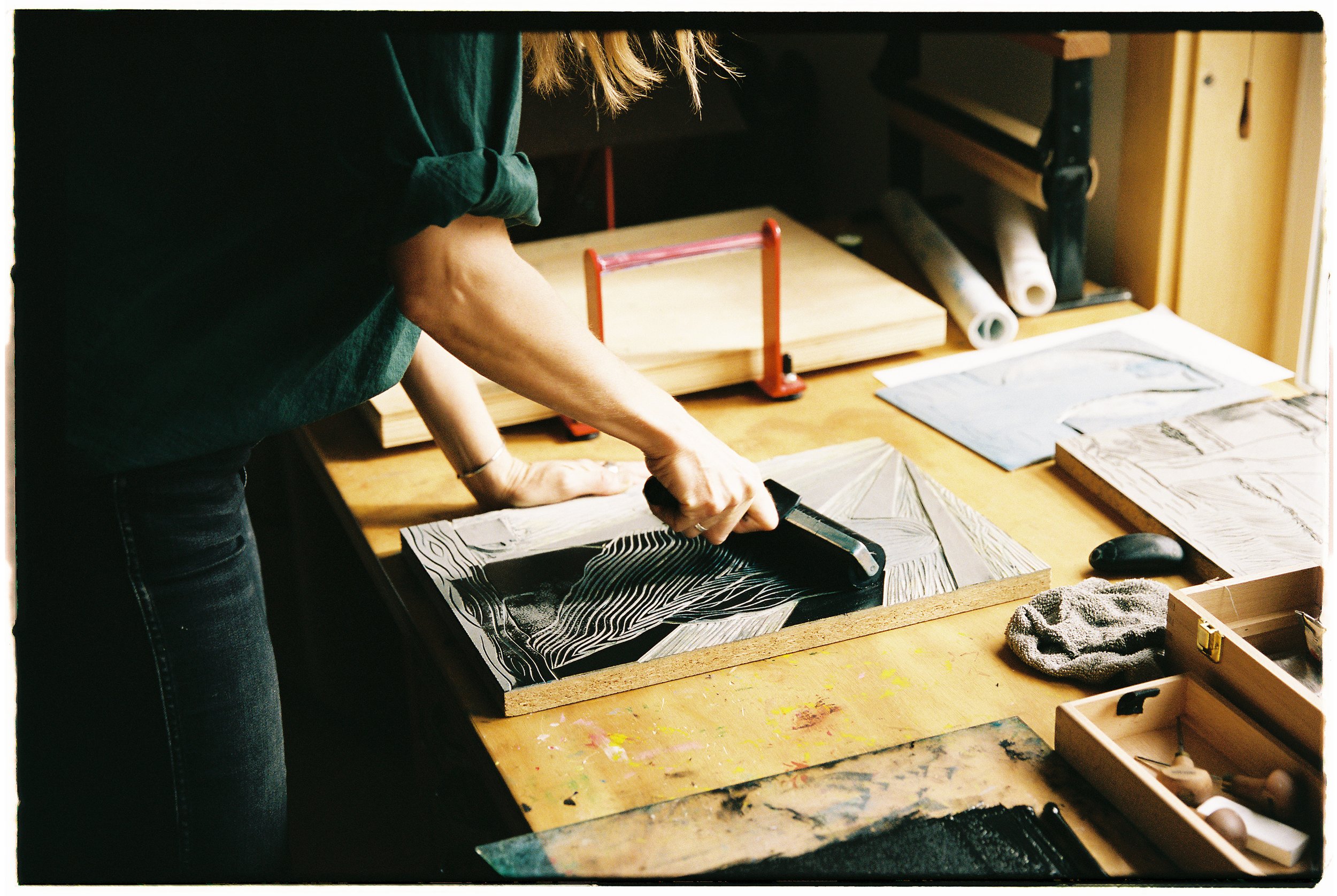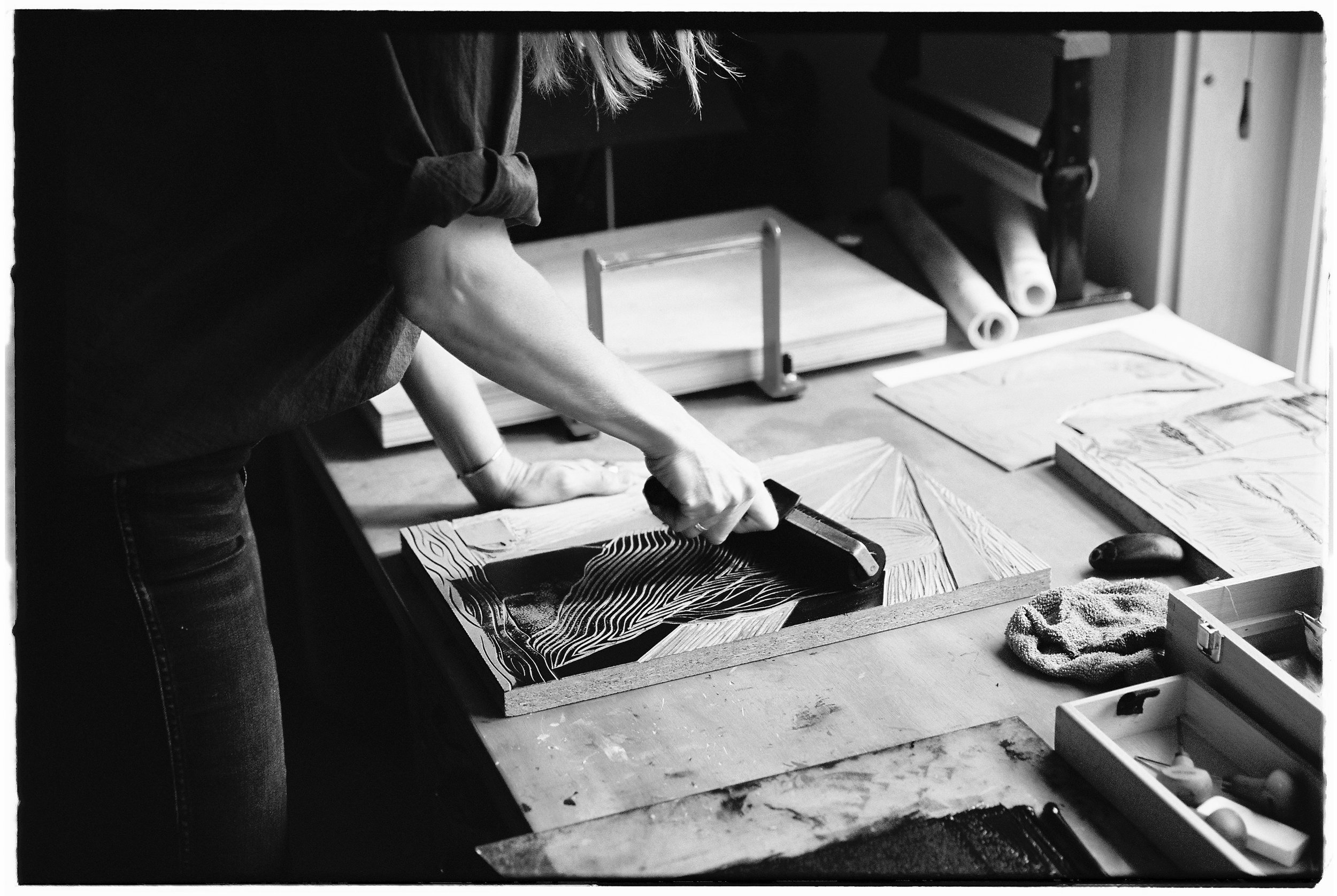 Drawing an image, intuiting the division of negative space and color, choosing fine paper for printing, and carving the block—the process of printing creates a flow that has informed other areas of my life. In the beginning, it feels lengthy and at times almost cumbersome, but with practice, the process becomes both a meditation and second nature.